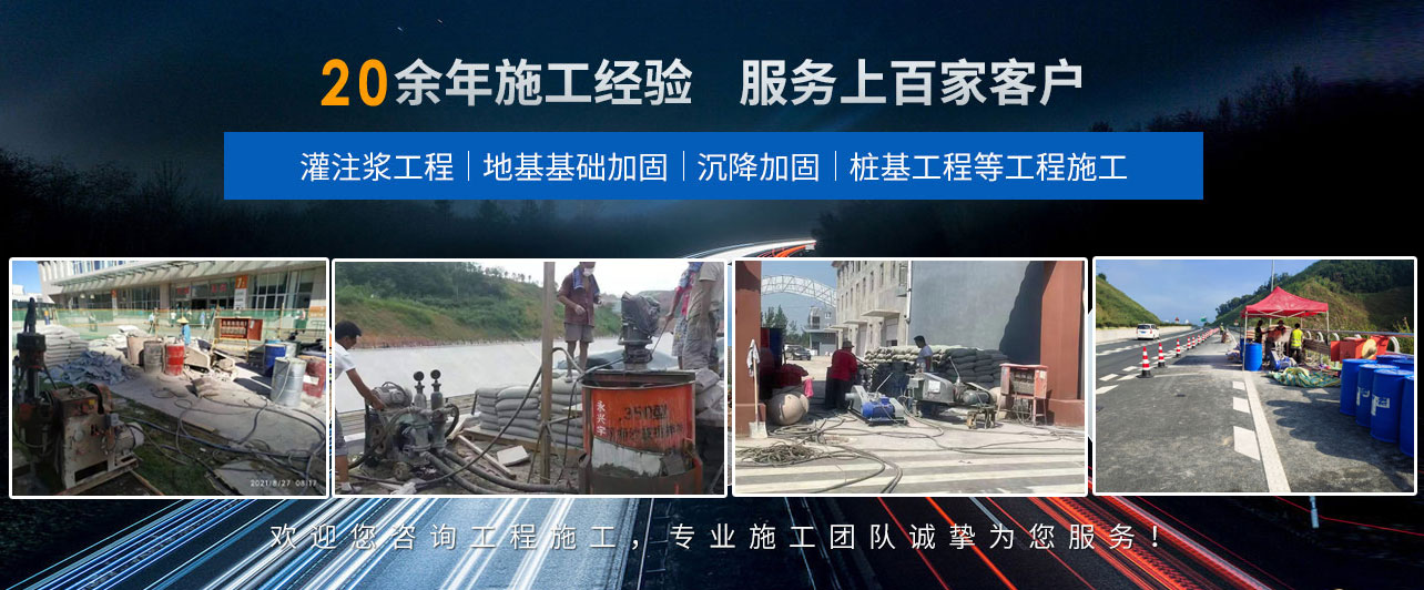 承接全国范围内高压注浆 ,地基下沉注浆,房屋下沉注浆,设备基础下沉注浆,铁路路基下沉注浆,厂房地基下沉注浆,路面下沉(塌陷)注浆 等施工业务,公司拥有机械设备百余台,施工证书资质齐全,专业技术施工人员200余人,专业处理各种复杂地基工程,成功案例数千件,施工质量保证。